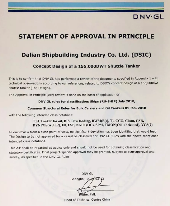 11月20日,大船集团在总部举行了“15.5万吨穿梭油船”和“通用型FPSO”设计AIP证书颁发仪式,两型新产品获得DNV·GL原则性认可。