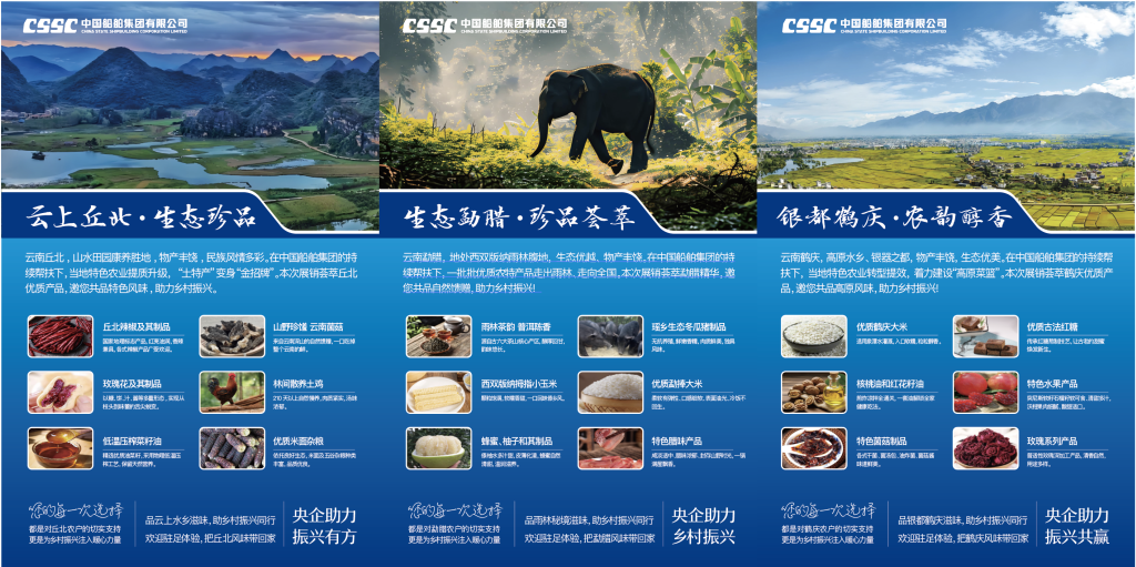 百家央企聚合力,消费帮扶促振兴。中船集团积极响应国家号召,自2018年起持续对云南鹤庆、丘北、勐腊三县开展消费帮扶,通过“以购代扶、以销促产”的有效路径,走出了乡村振兴的坚实步伐。同时,中船集团以“中船集团电子商城”“中船·惠民优选”线上平台为依托,充分挖掘并推广三个帮扶县特色农产品资源,系统推进消费帮扶工作落地落实。